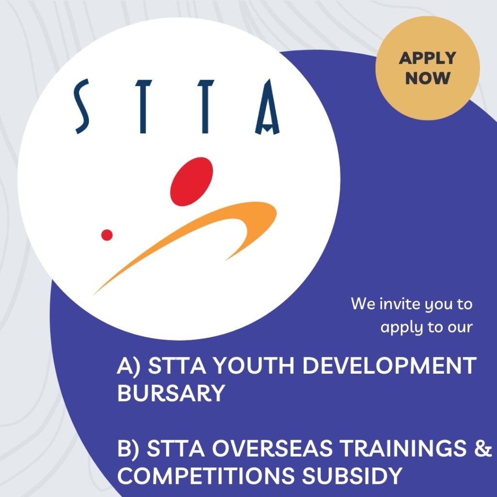 The above bursary and subsidy aim to provide financial assistance to talented young athletes from less-privileged backgrounds: for overseas trainings or competitions. and /or the cost of training in the STTA Junior Development Squad or Youth Training Squad programs.